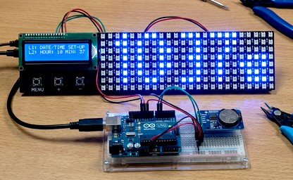 A korábba már bemutatott, DS3231 óramodulra alapozott Arduino‑óra most látványos frissítést kapott: a klasszikus 2×16-os LCD kijelző mellé egy színes WS2812 LED‑mátrix is csatlakozott.